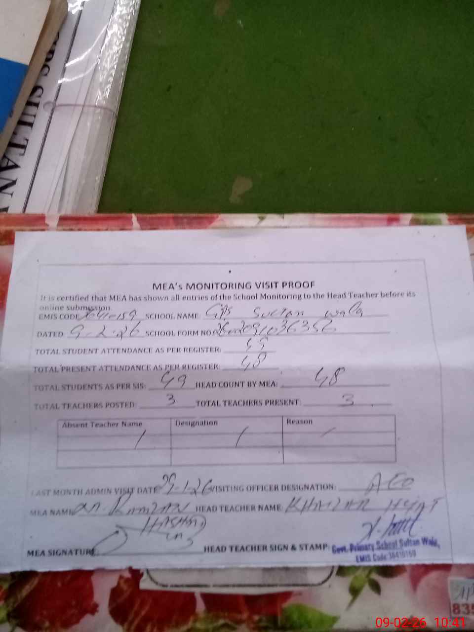 | EMIS Code: 36410159 | Name of School: GPS SULTAN WALA, P/O HAQ NAWAZ WALA, KABIRWALA | |||