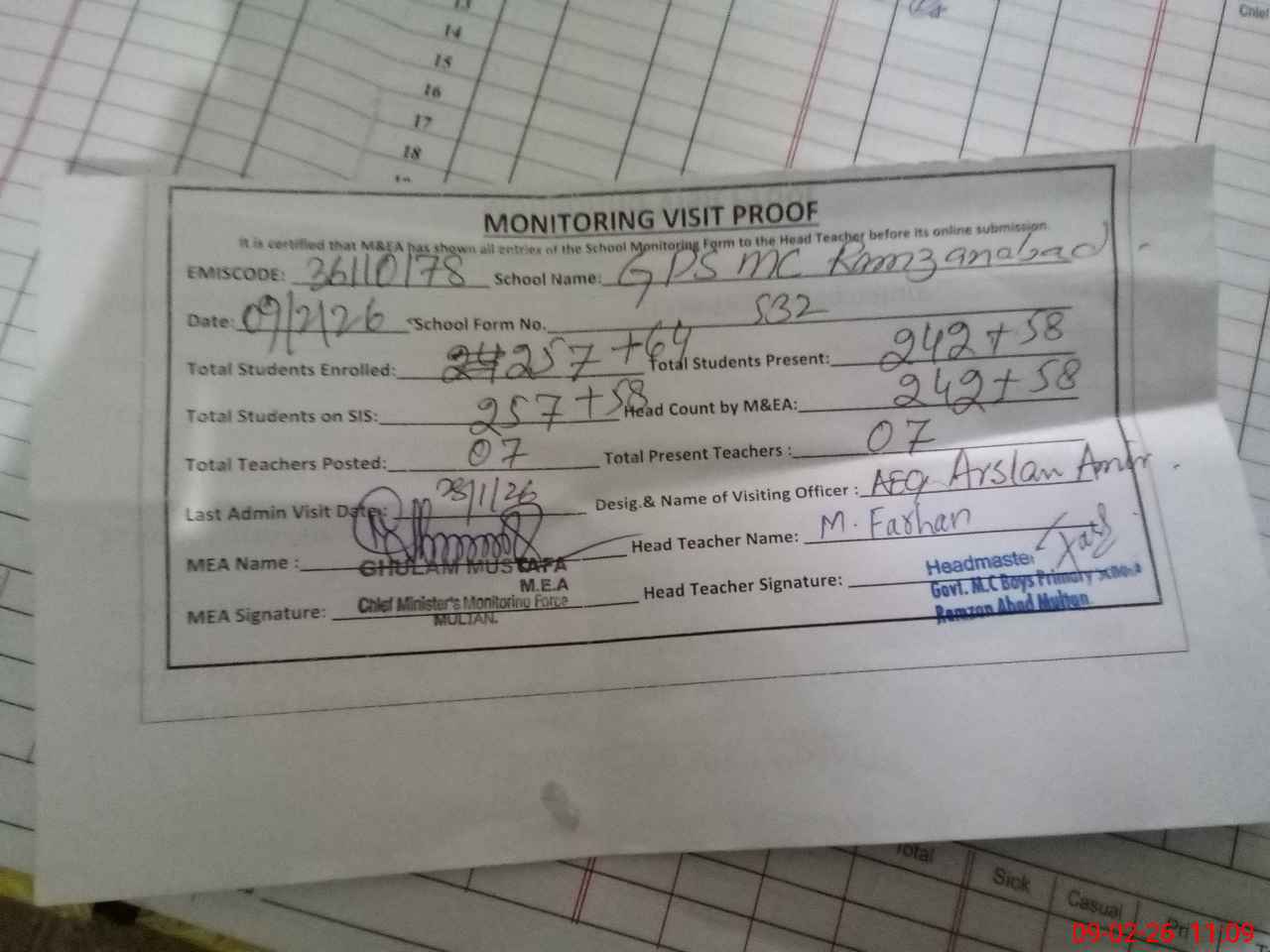 | EMIS Code: 36110178 | Name of School: GPS MC RAMZAN ABAD MULTAN | |||