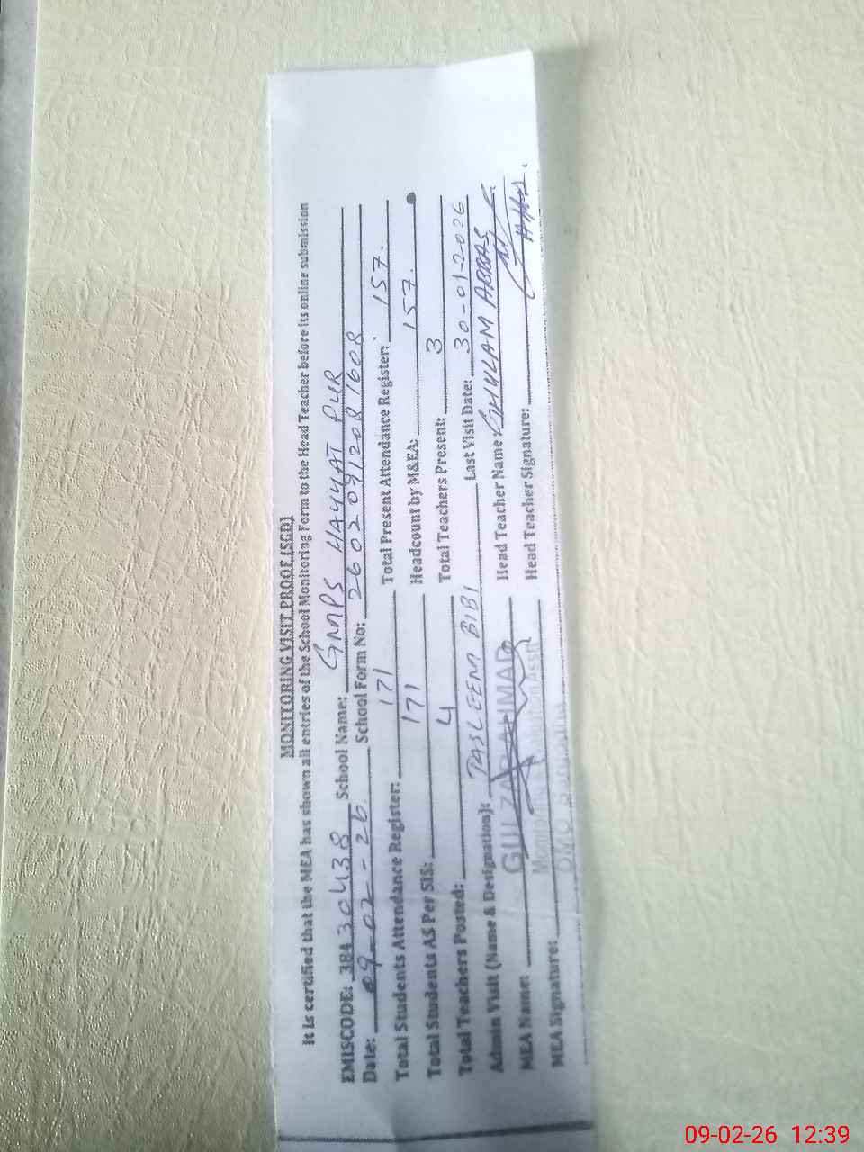 | Attendance Register | Head Teacher | MEA with School | Visit Proof |