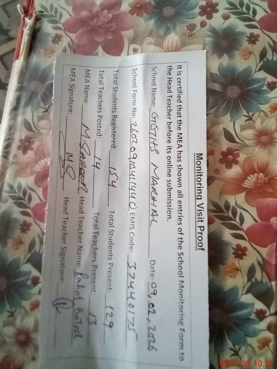| Attendance Register | Head Teacher | MEA with School | Visit Proof |