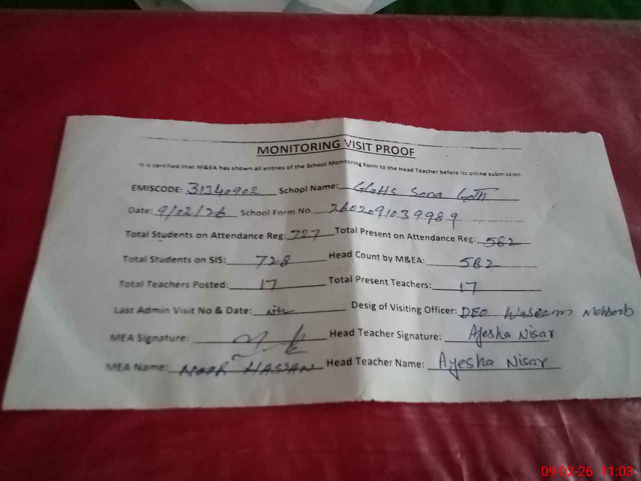 | Attendance Register | Head Teacher | MEA with School | Visit Proof |
