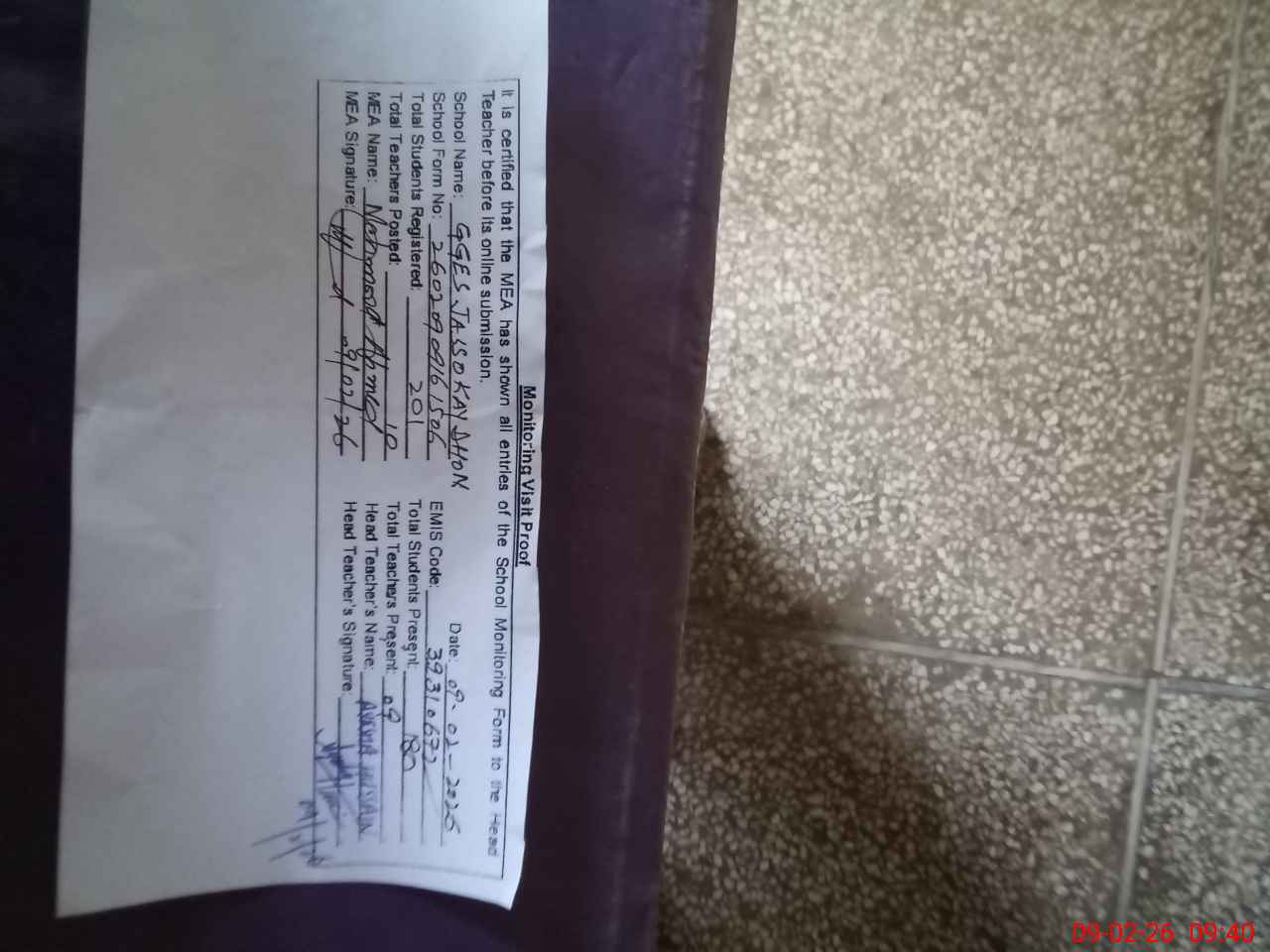 | Attendance Register | Head Teacher | MEA with School | Visit Proof |