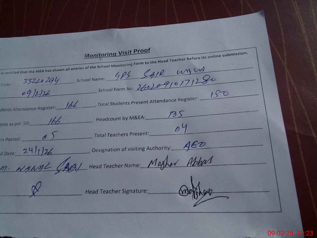 | EMIS Code: 33220294 | Name of School: GPS SAIR WALA | |||