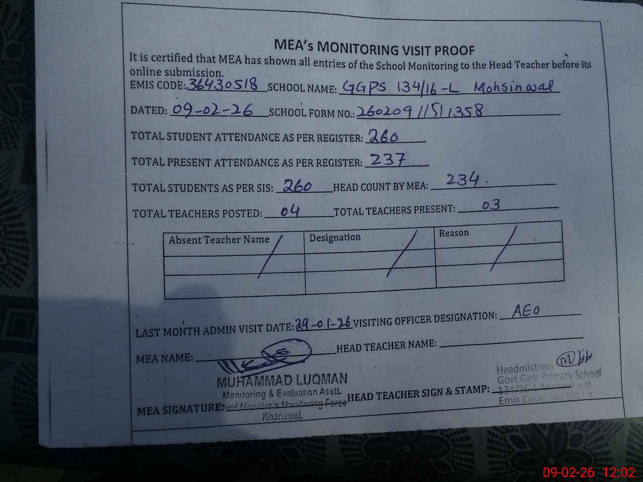 | EMIS Code: 36430518 | Name of School: GGPS CHAK NO. 134/16-L MOHSINWAL | |||