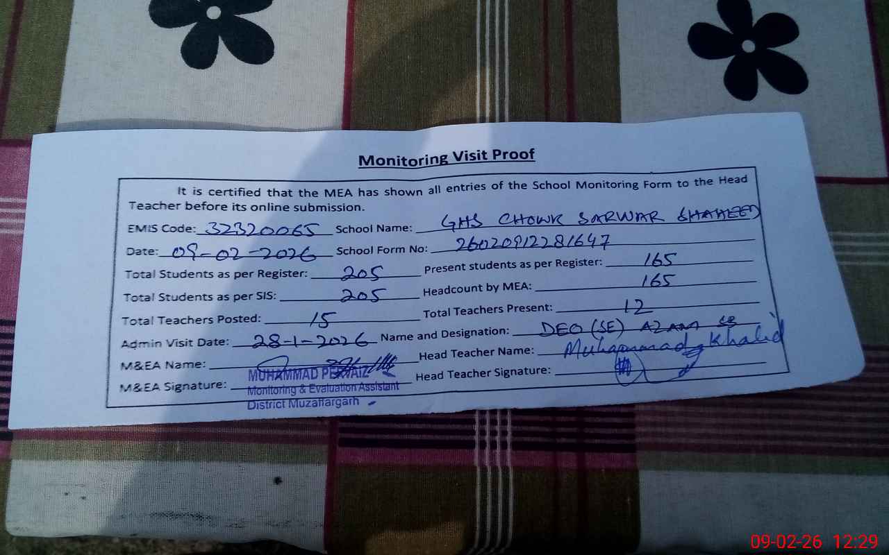 | EMIS Code: 32320065 | Name of School: GHS CHOWK SARWAR SHAHEED | |||