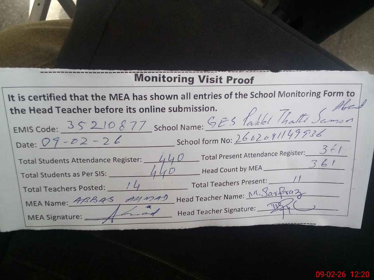 | Attendance Register | Head Teacher | MEA with School | Visit Proof |