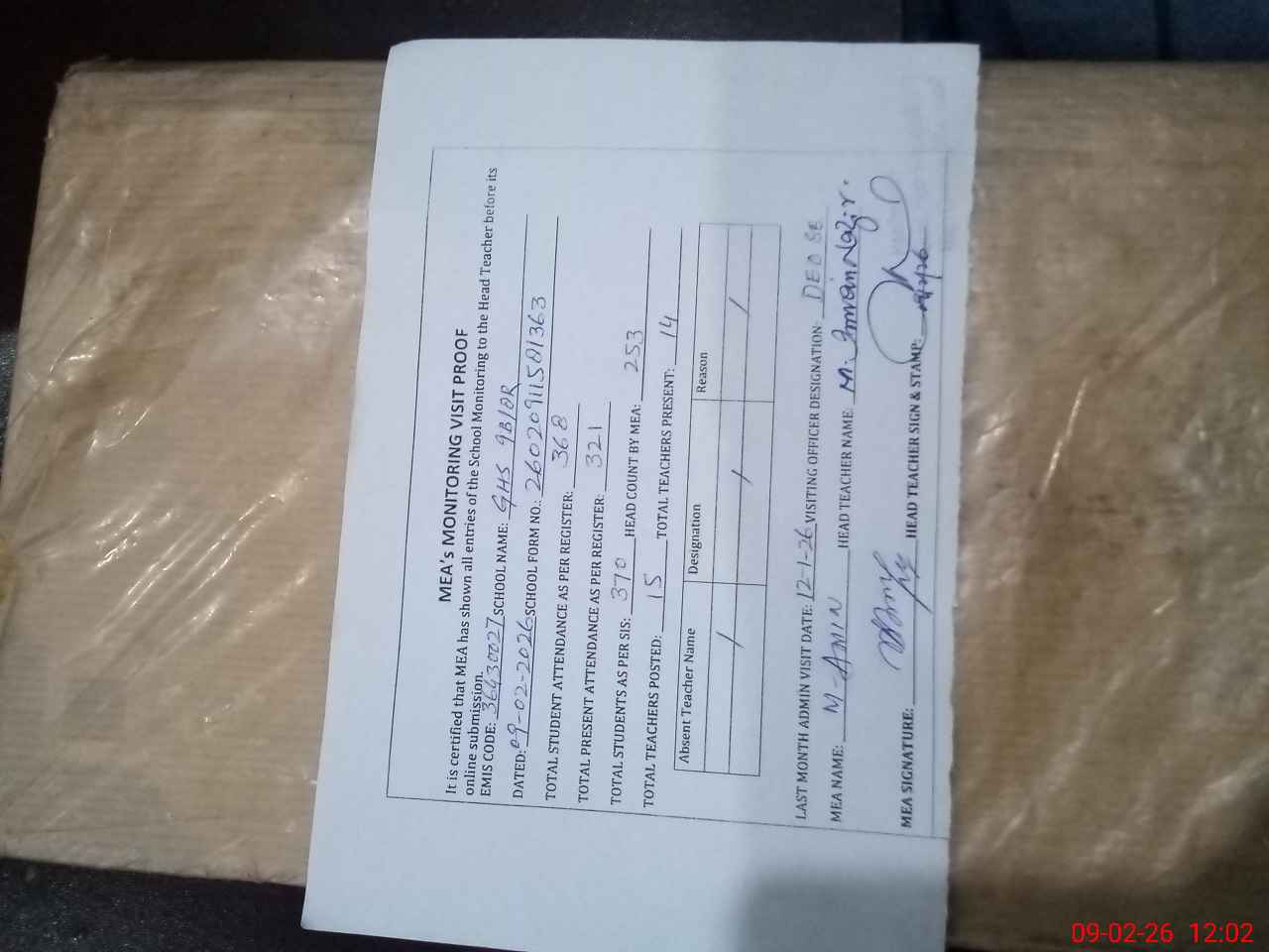 | Attendance Register | Head Teacher | MEA with School | Visit Proof |