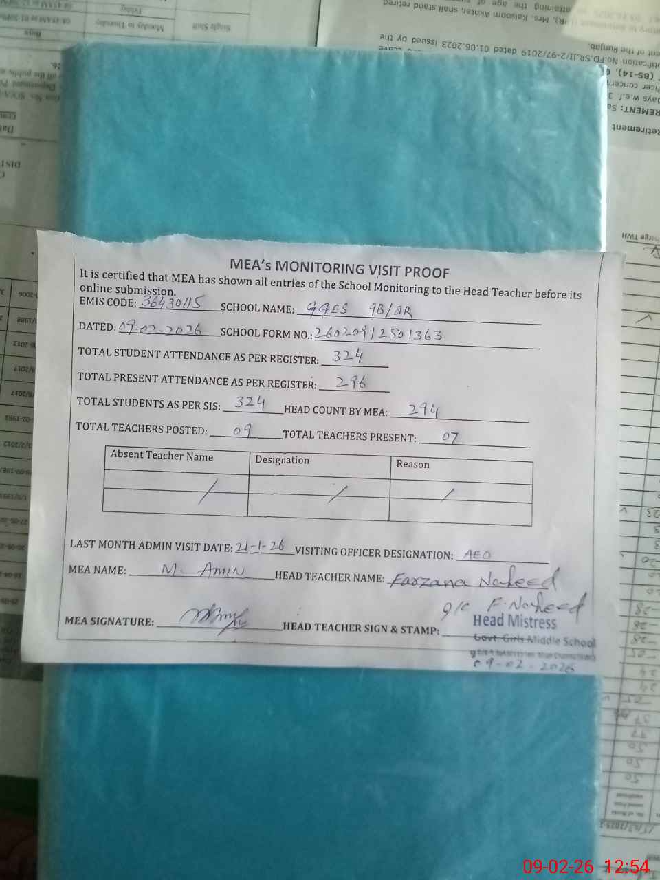 | Attendance Register | Head Teacher | MEA with School | Visit Proof |