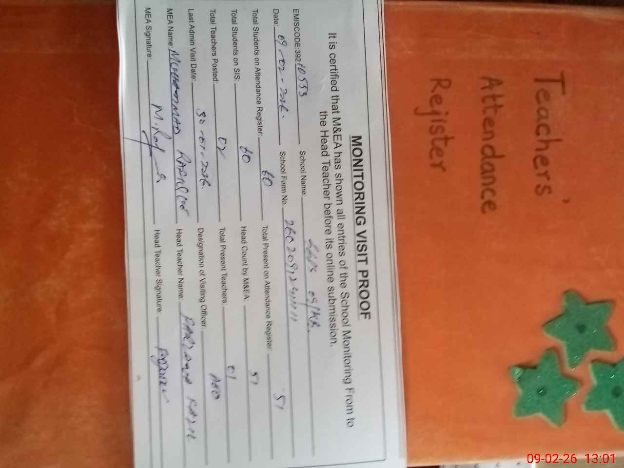 | Attendance Register | Head Teacher | MEA with School | Visit Proof |