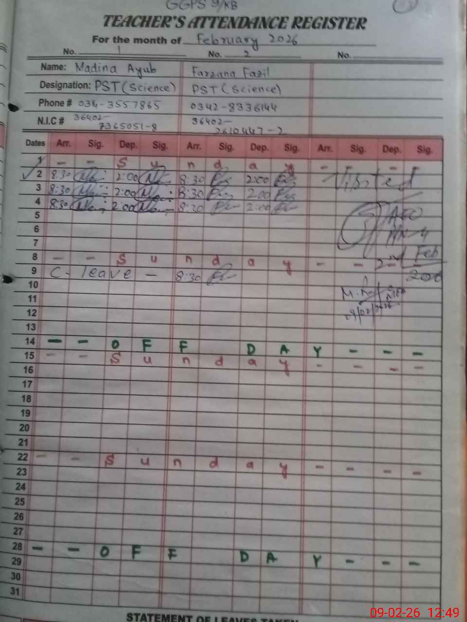 | CNIC | Full Name | Designation | R/C | Absence During Last Calender Month |