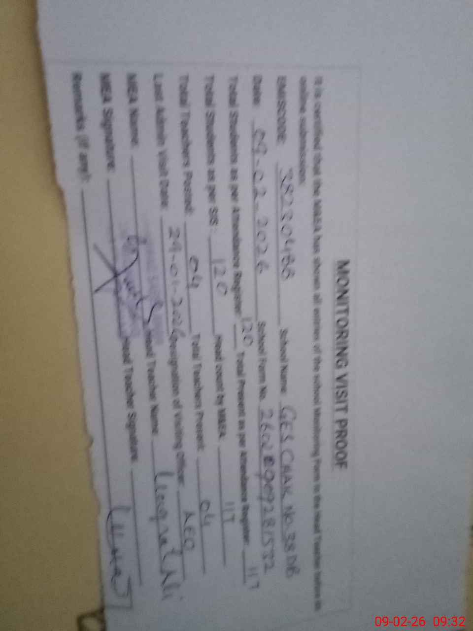 | Remarks (Use Separate Page if Required): Students on SIS Qty 120 Last admin visit On 29 January 2026 by AEO | |||||