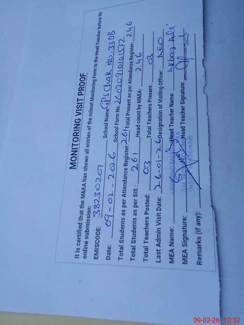 | Remarks (Use Separate Page if Required): Students on SIS Qty 261 Last admin visit On 26 January 2026 by AEO | |||||