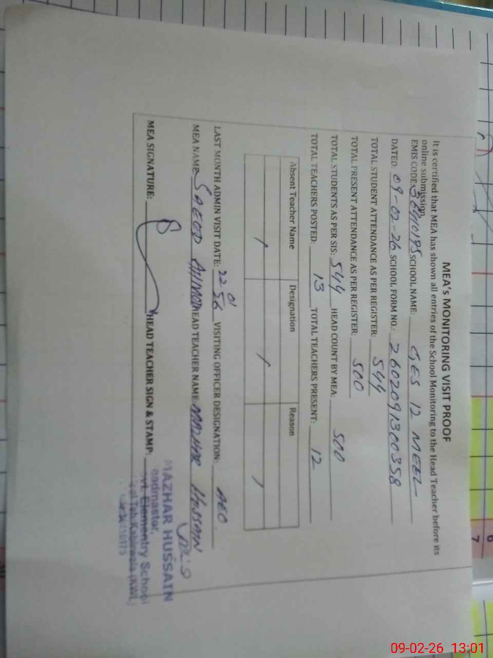 | Attendance Register | Head Teacher | MEA with School | Visit Proof |