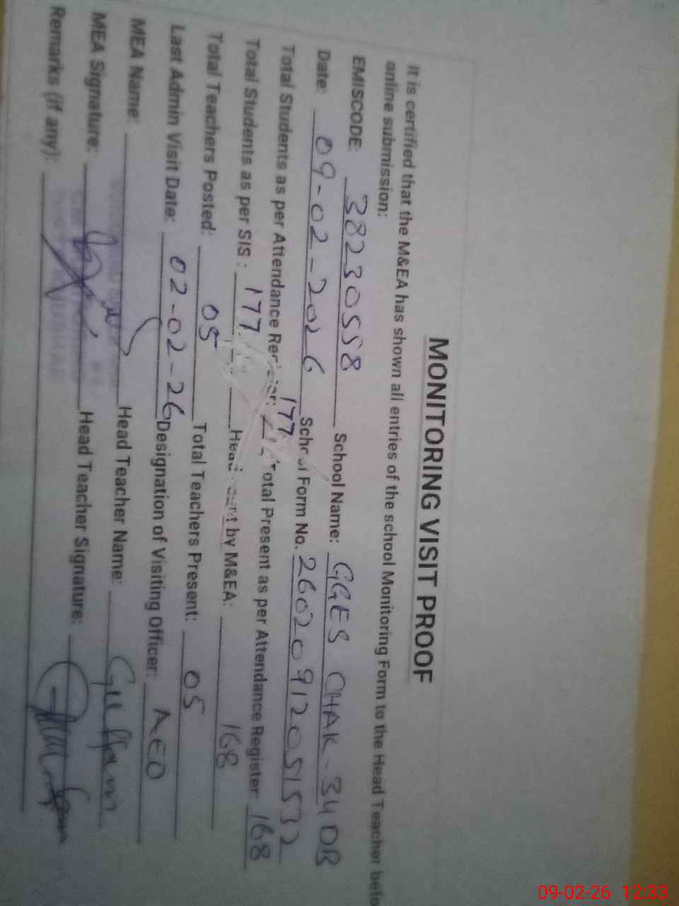 | Remarks (Use Separate Page if Required): Students on SIS Qty 177 Last admin visit On 02 February 2026 by AEO | |||||