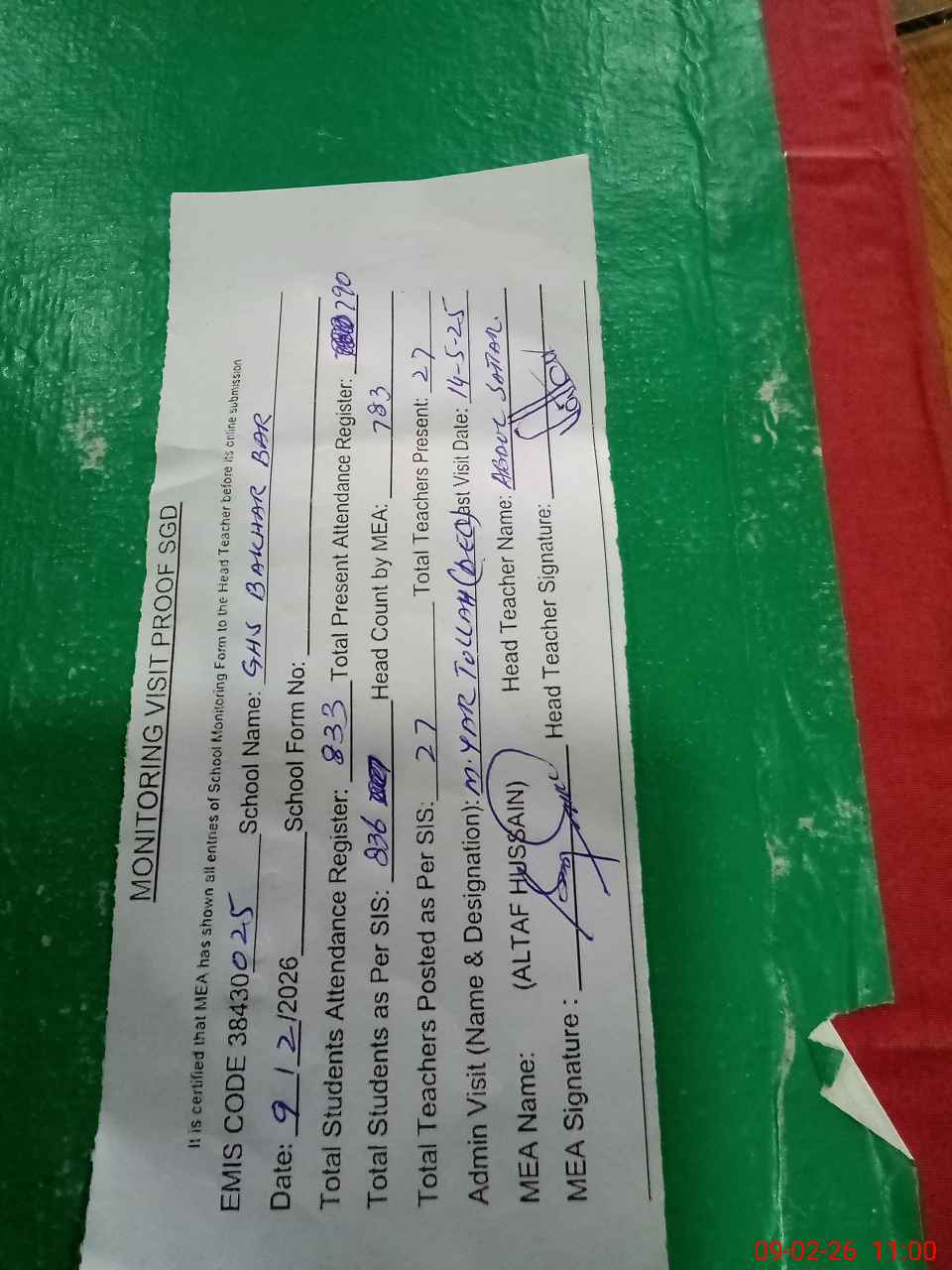 | Attendance Register | Head Teacher | MEA with School | Visit Proof |