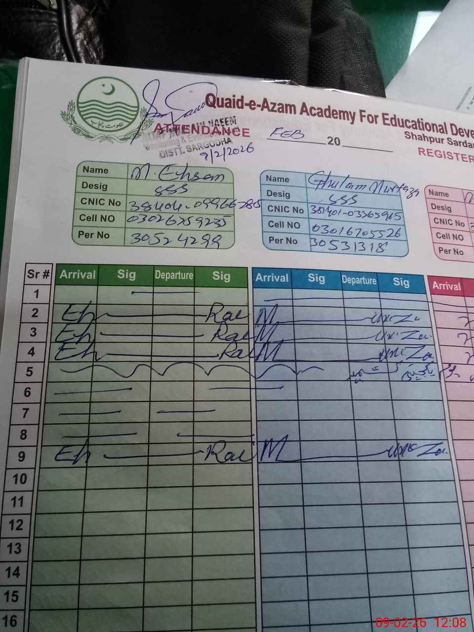 | CNIC | Full Name | Designation | R/C | Absence during last cal. month |