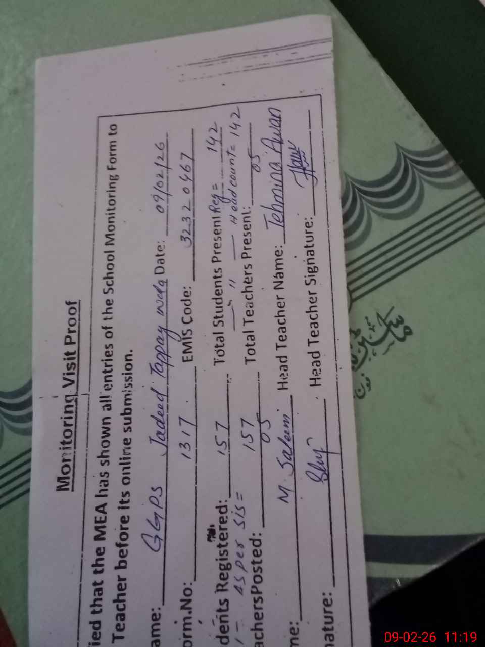 | Attendance Register | Head Teacher | MEA with School | Visit Proof |