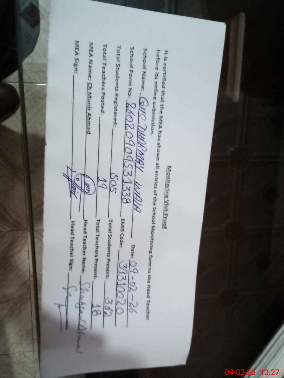 | Attendance Register | Head Teacher | MEA with School | Visit Proof |