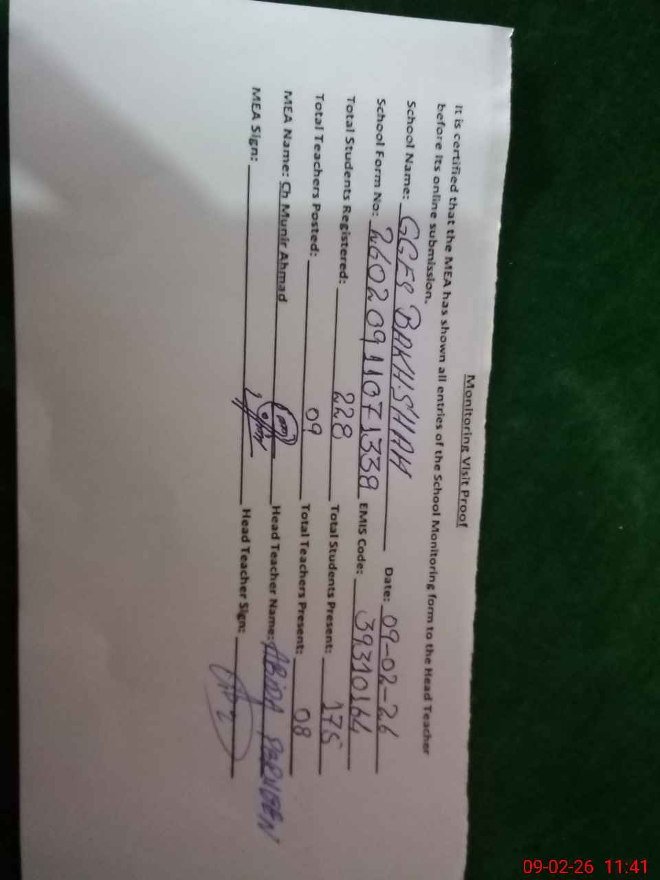 | Certified that this School was Inspected by the Undersigned MEA/DMO Today and the Information Stated Above is as Per Record. | |||||