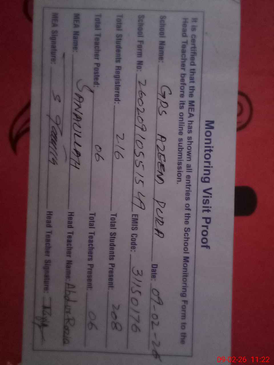 | EMIS Code: 31150176 | Name of School: GPS AZEEM PURA | |||