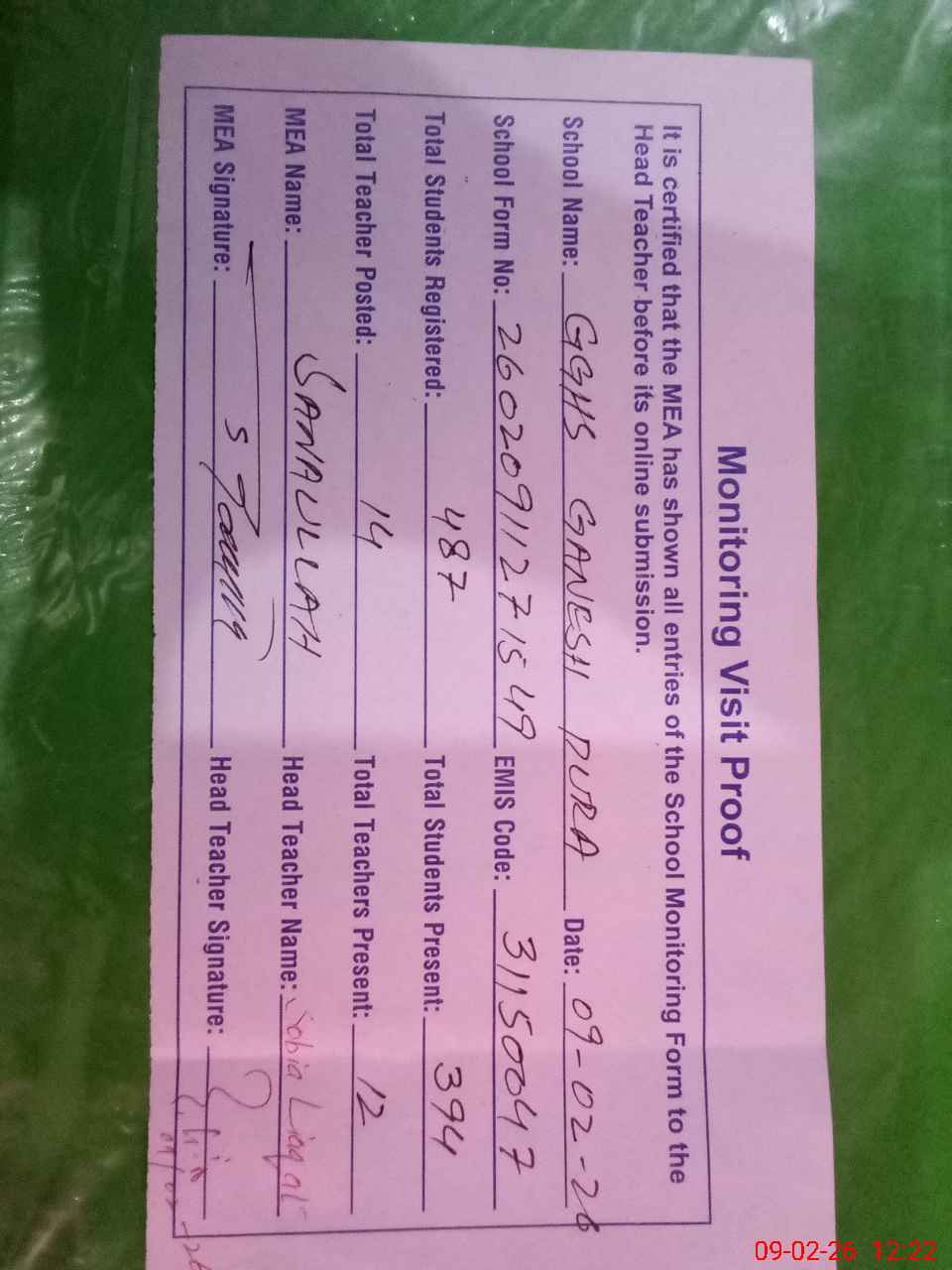 | Attendance Register | Head Teacher | MEA with School | Visit Proof |