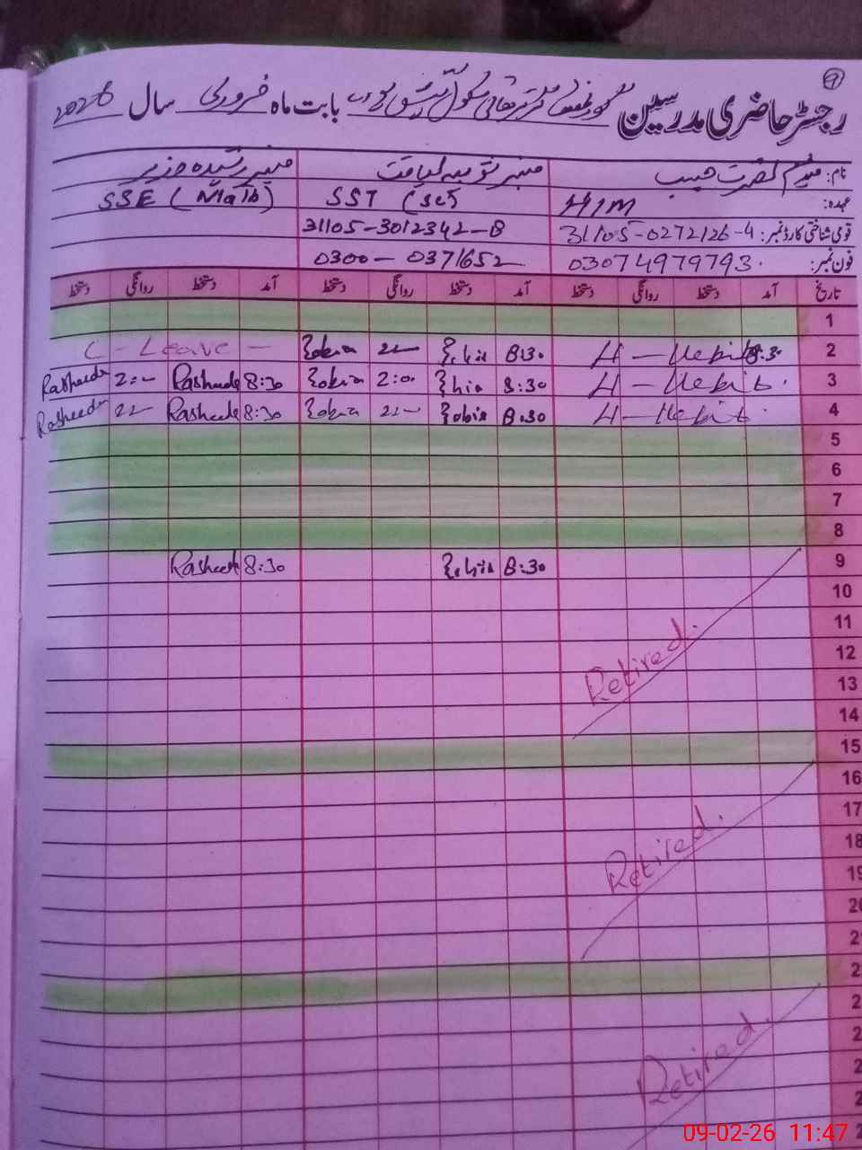 | CNIC | Full Name | Designation | R/C | Absence During Last Calender Month |