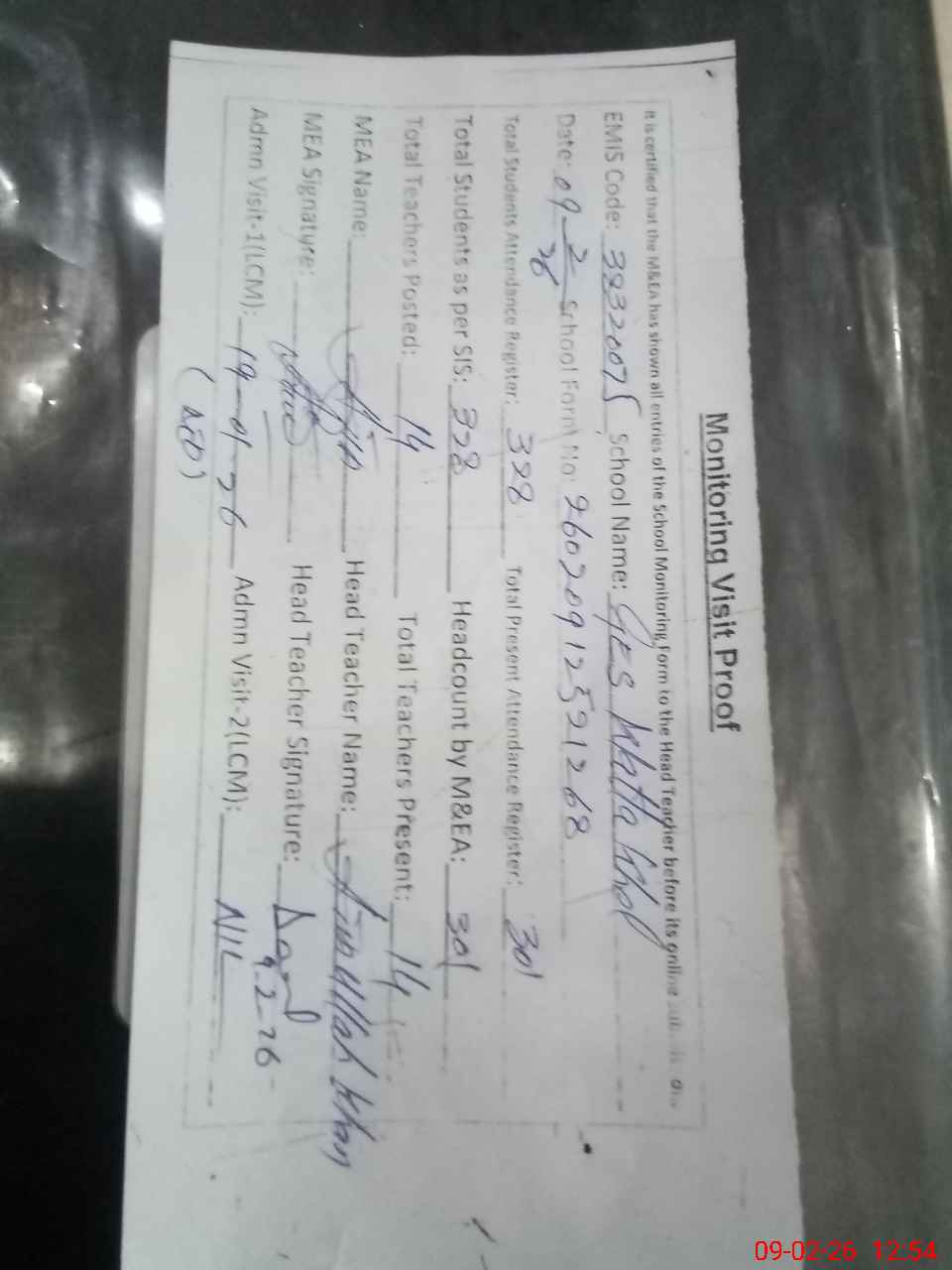 | Attendance Register | Head Teacher | MEA with School | Visit Proof |