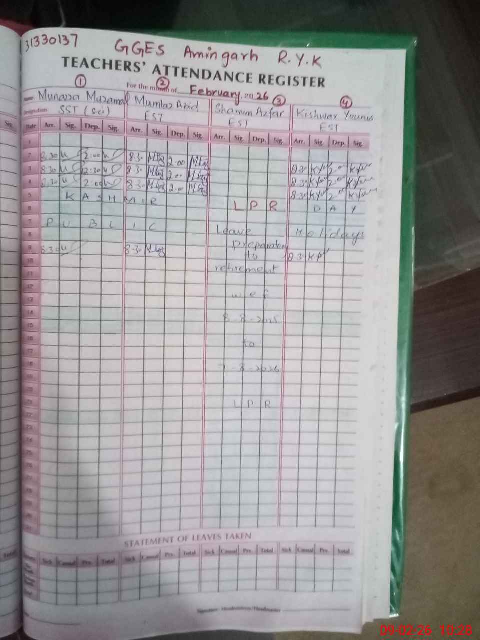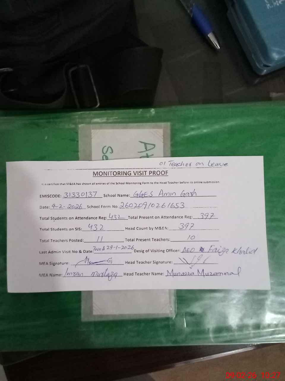 | Attendance Register | Head Teacher | MEA with School | Visit Proof |