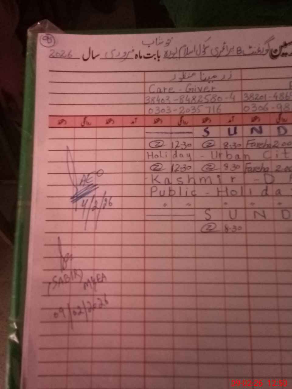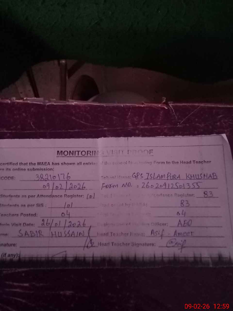 | Remarks (Use Separate Page if Required): no teacher absent total students on register 101 total students on SiS 101 last admin visit by AEO 26 Jan 2026 | |||||