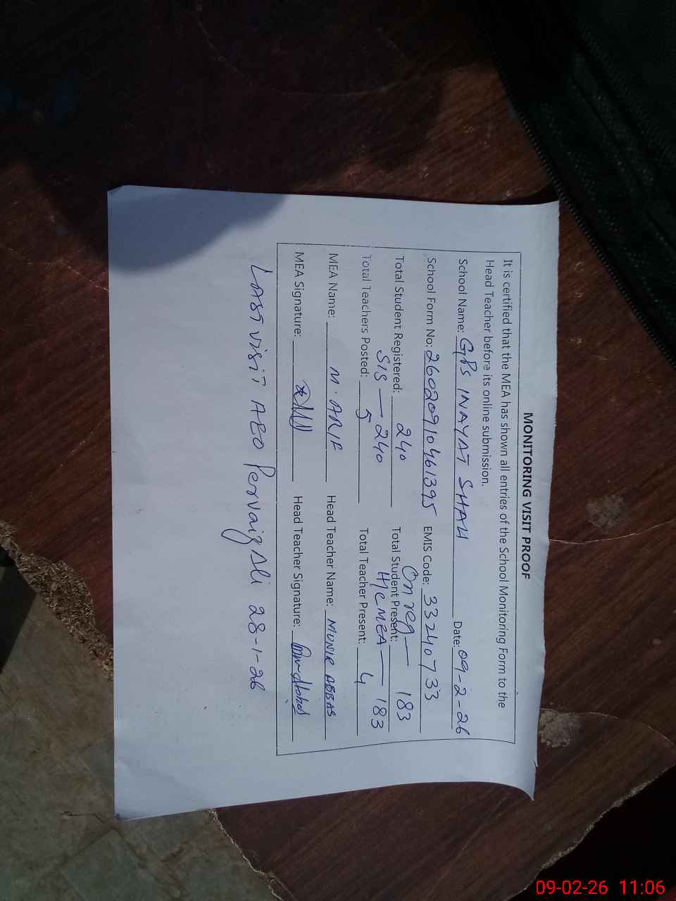 | Attendance Register | Head Teacher | MEA with School | Visit Proof |
