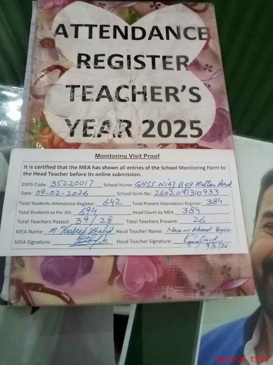 | Attendance Register | Head Teacher | MEA with School | Visit Proof |