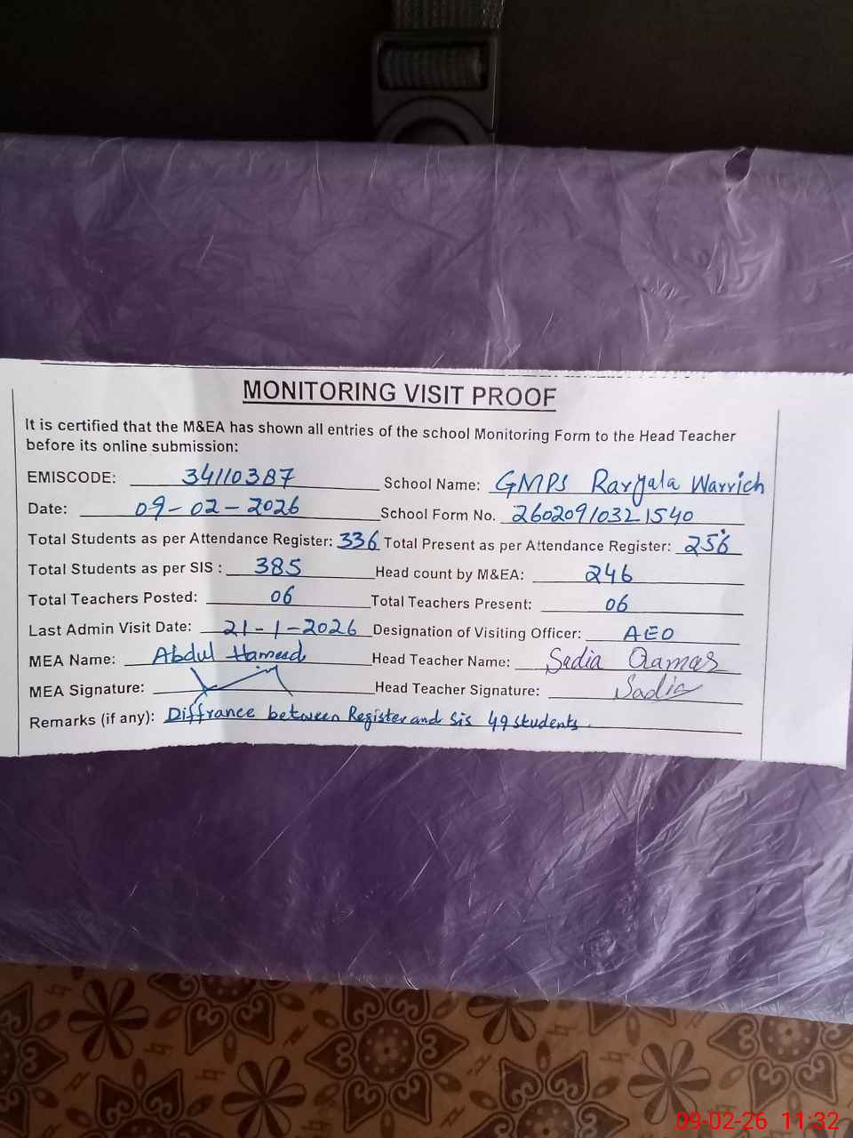 | EMIS Code: 34110387 | Name of School: GMPS RARYALA WARRICH | |||