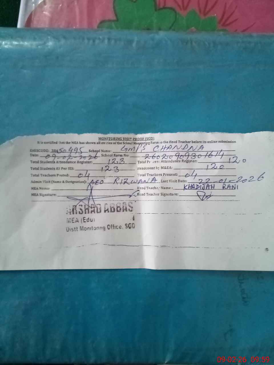 | Attendance Register | Head Teacher | MEA with School | Visit Proof |
