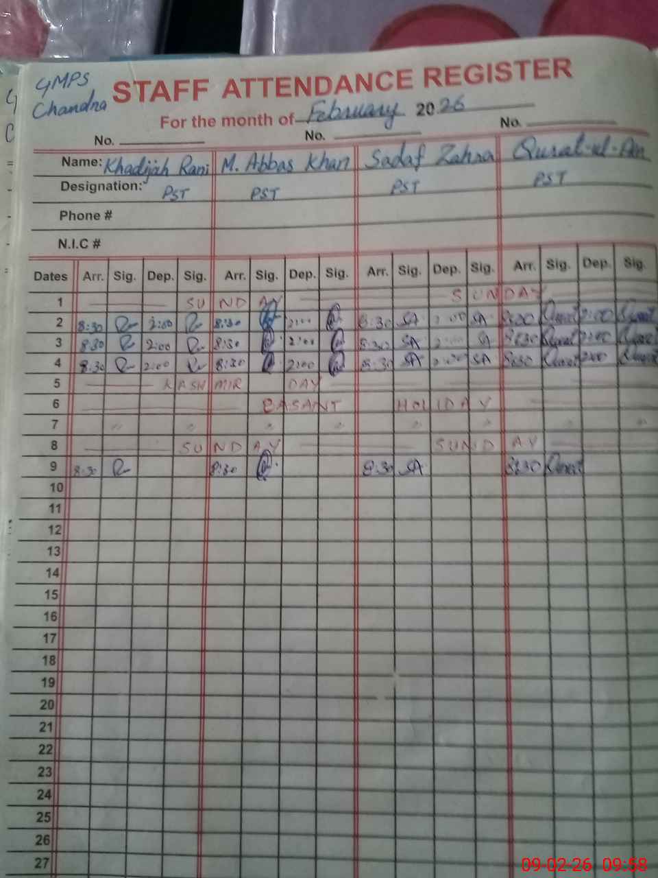 | Name: KH**** RA**** Designation: (School Headmaster's/Headmistress's) PST Phone/Cell Number: 03**** |