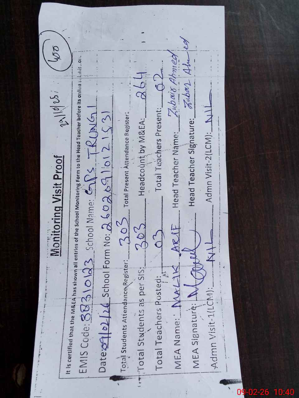 | Attendance Register | Head Teacher | MEA with School | Visit Proof |