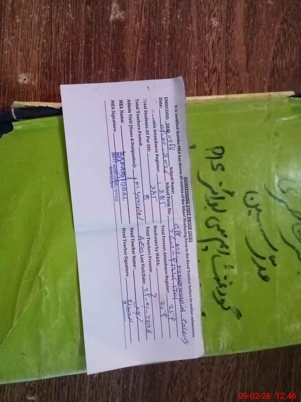 | Attendance Register | Head Teacher | MEA with School | Visit Proof |