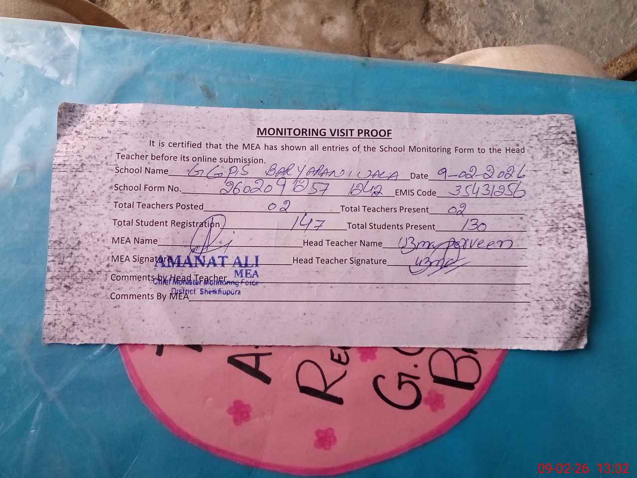 | EMIS Code: 35431256 | Name of School: GGPS BAR YARAN WALA | |||