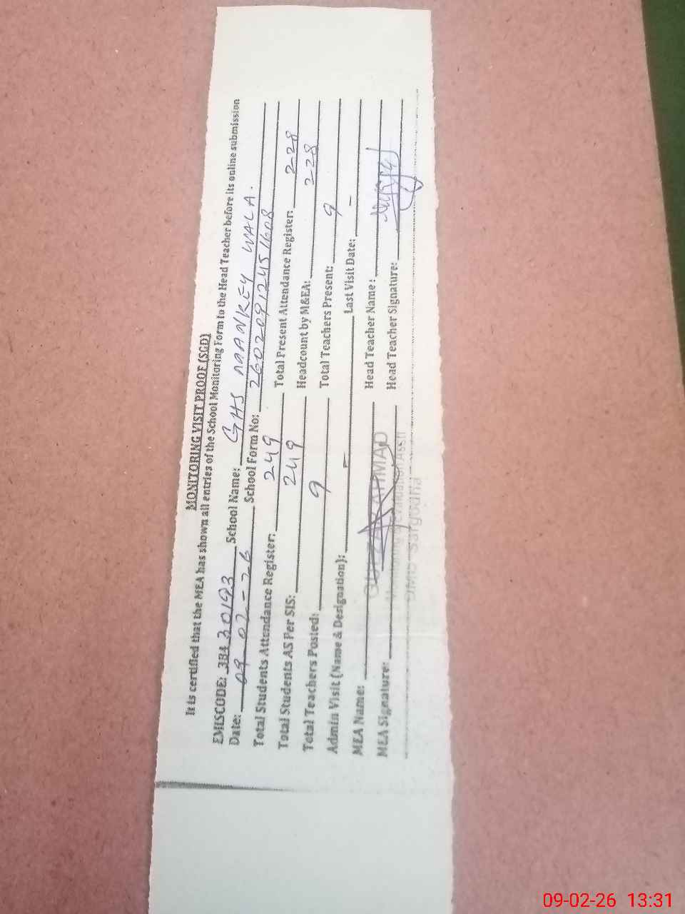 | Attendance Register | Head Teacher | MEA with School | Visit Proof |
