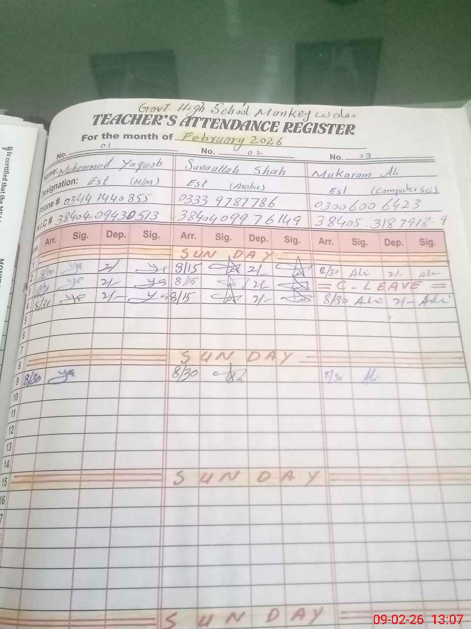 | CNIC | Full Name | Designation | R/C | Absence during last cal. month |