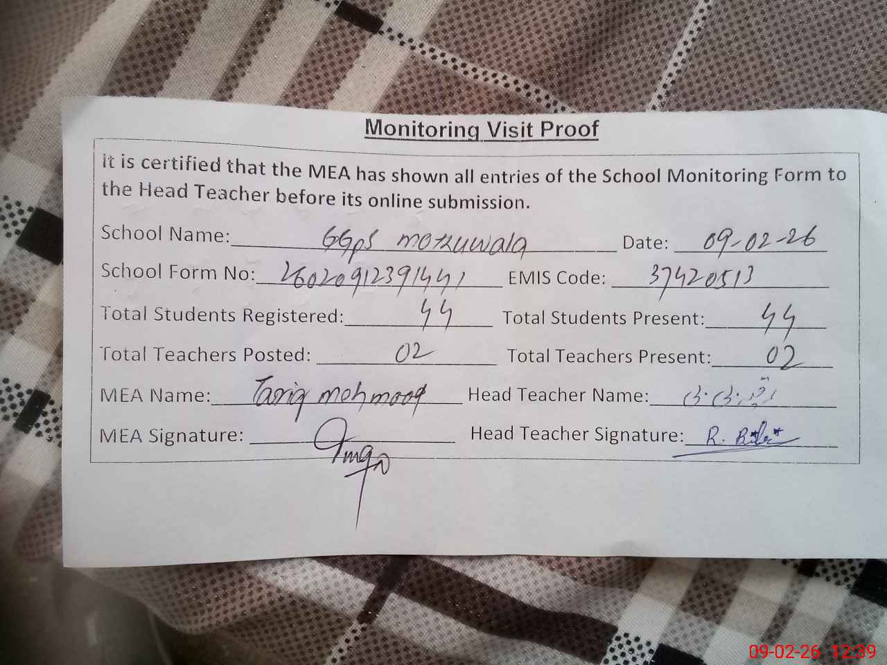 | Certified that this School was Inspected by the Undersigned MEA/DMO Today and the Information Stated Above is as Per Record. | |||||