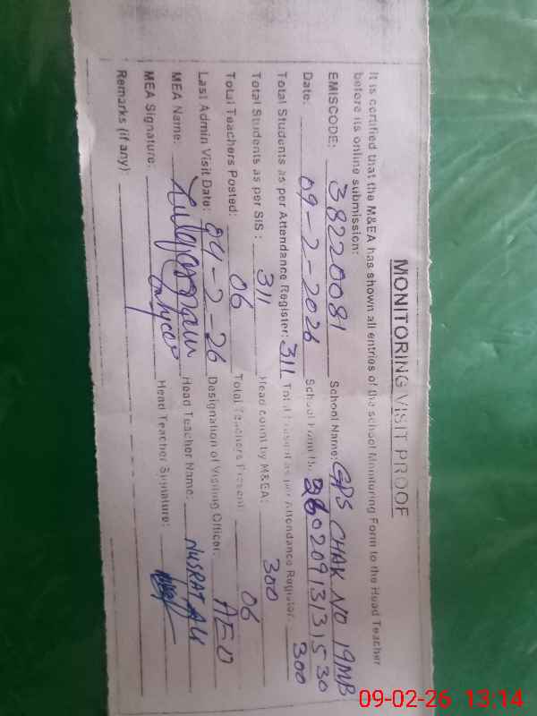 | EMIS Code: 38220081 | Name of School: GPS CHAK NO. 19 MB | |||