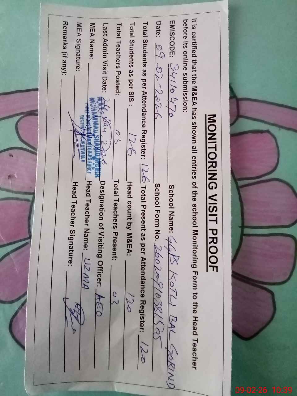 | Attendance Register | Head Teacher | MEA with School | Visit Proof |