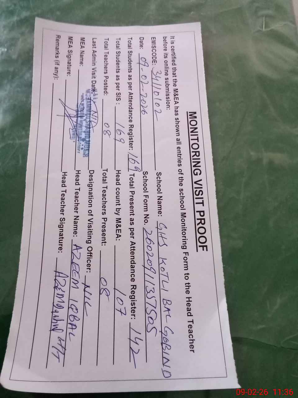 | Attendance Register | Head Teacher | MEA with School | Visit Proof |
