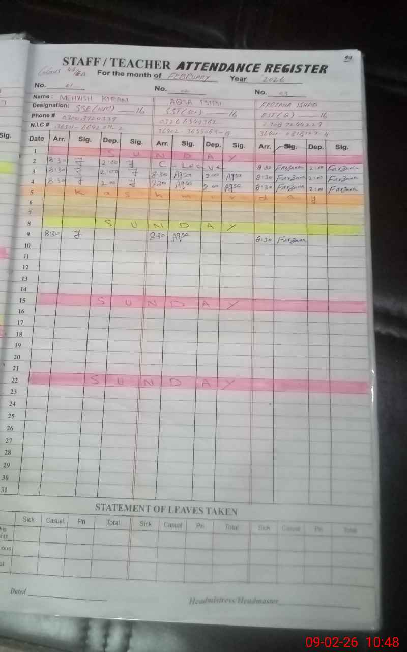 | CNIC | Full Name | Designation | R/C | Absence During Last Calender Month |