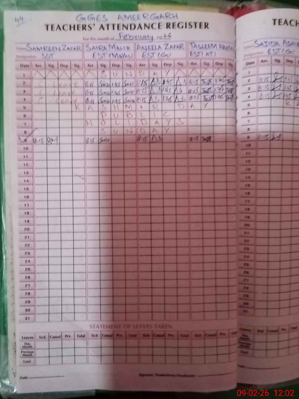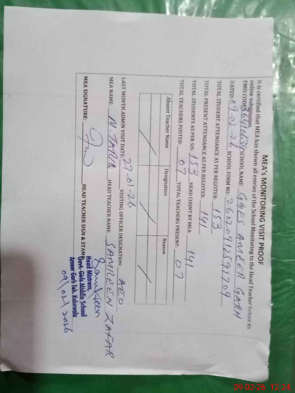 | Attendance Register | Head Teacher | MEA with School | Visit Proof |