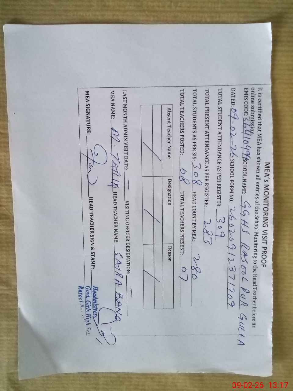 | EMIS Code: 36410494 | Name of School: GGHS RASOOL PUR GULLA, NAWAN SHEHR | |||