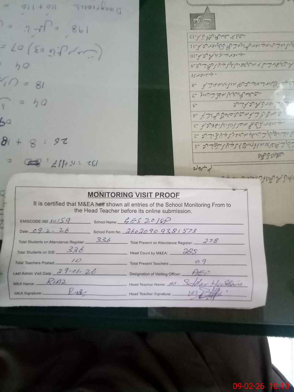 | Attendance Register | Head Teacher | MEA with School | Visit Proof |