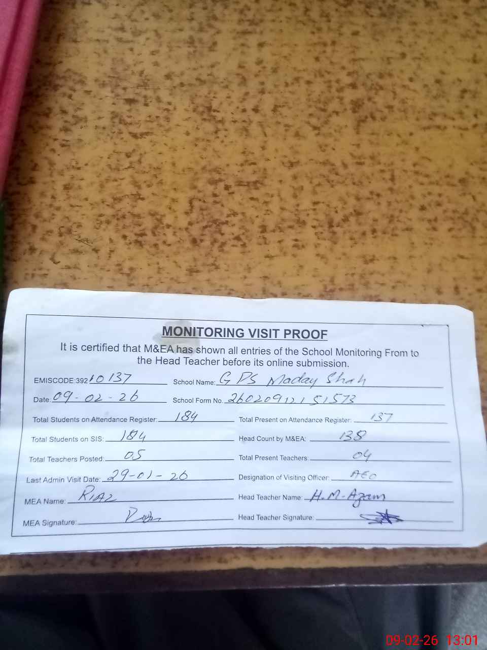 | Attendance Register | Head Teacher | MEA with School | Visit Proof |