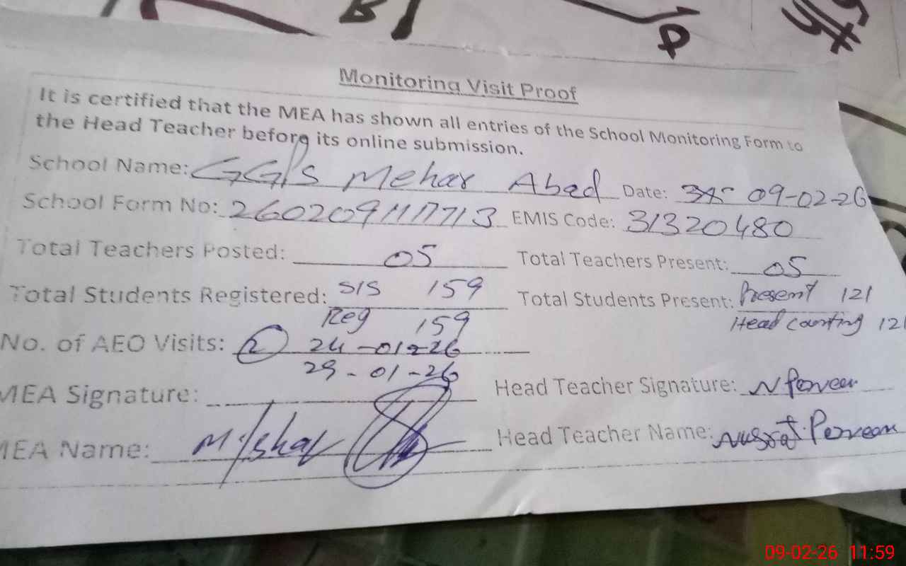 | EMIS Code: 31320480 | Name of School: GGPS MEHAR ABAD KACHI MANDI | |||