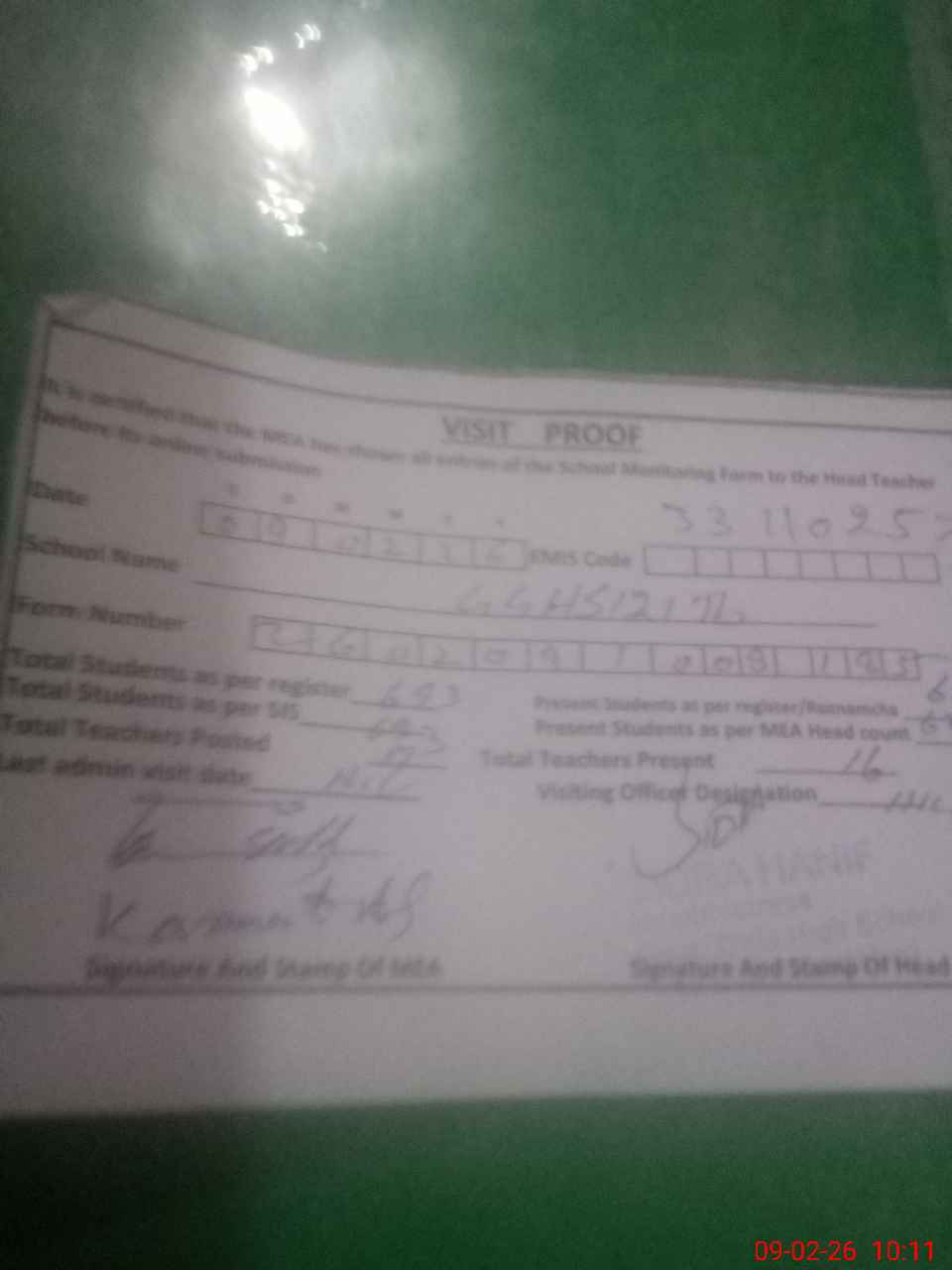 | Attendance Register | Head Teacher | MEA with School | Visit Proof |